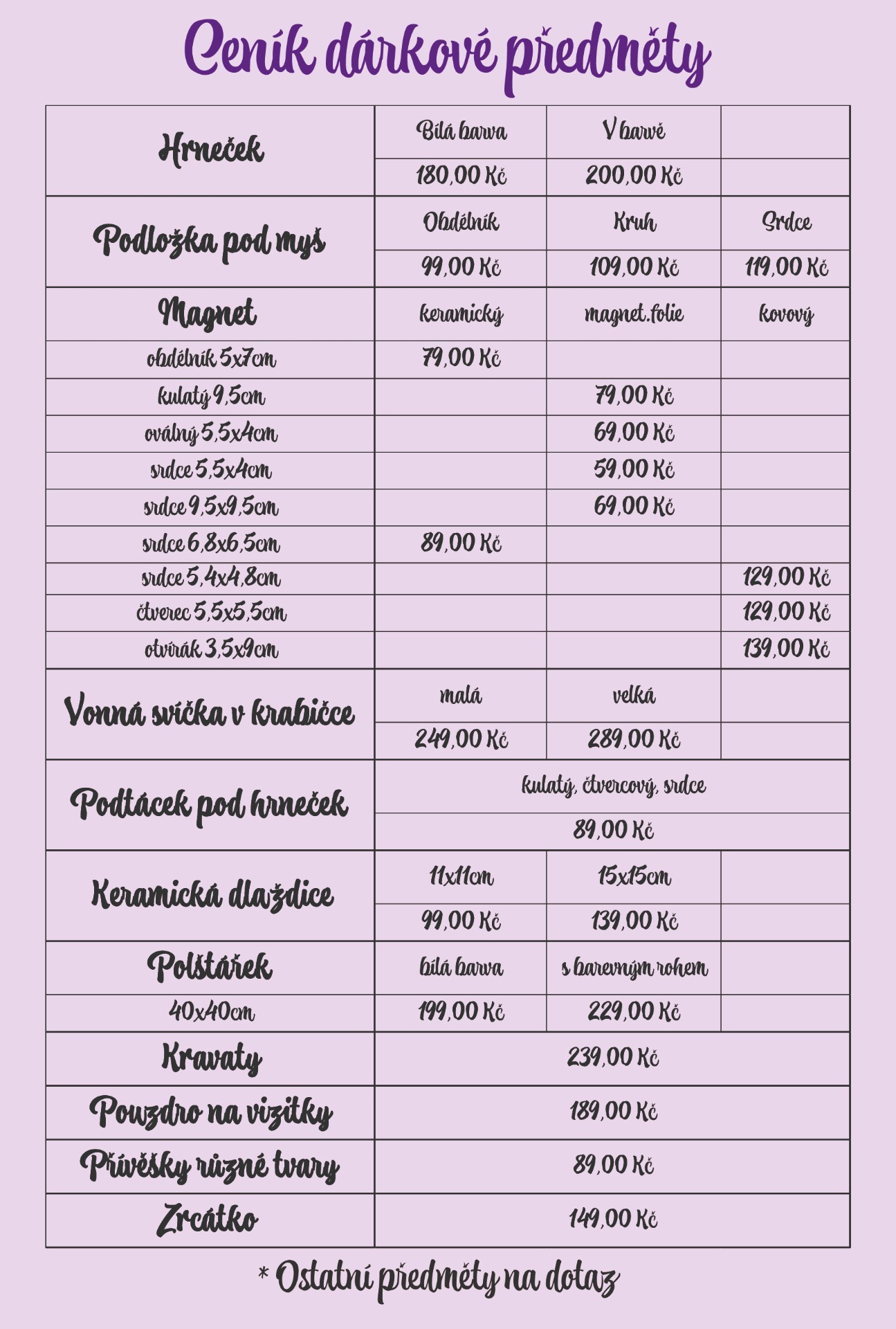 Ceník potisku, dárkových předmětů a samolepek